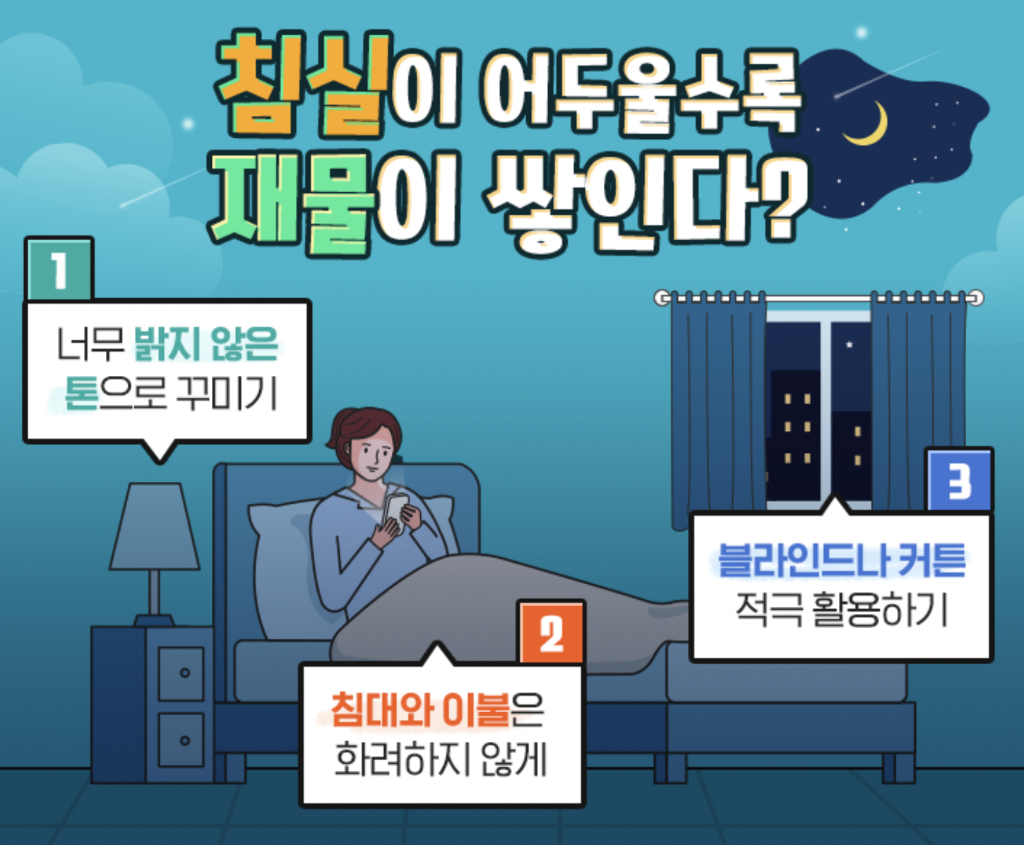 좋은 기운이 새어나가지 않도록 블라인드나 커튼을 치는 것도 좋다. 따뜻하고 편안한 느낌을 주기 위해 간접조명을 추천합니다.