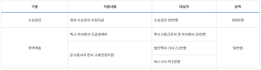 - 긴급생계비와 고용안정지원금으로 각각 50만원씩 지급